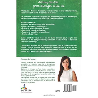«Ce livre est très pertinent et essentiel pour qui cherche à avoir une vie saine, avec l’alimentation comme base pour bâtir notre bonheur. C’est un livre à lire, et un guide de vie important à garder avec soi en tout temps ». Ahmed Zaky, BBC World Service« Ce livre nous rappelle que l’équilibre et le bonheur peuvent commencer maintenant, et il est à portée de chacun d’entre nous ». Dr Sanna NISSINEN, Professeur de Sociologie, Université de Londres.« Je recommande vivement le livre de Justine Lamboley si vous souhaitez améliorer votre bien-être et votre goût pour la vie" F. Dassie, France 24 “Pratiquez le Bonheur, Passeport pour la Santé” est un livre qui transformera votre vision de la santé, du bonheur et de la vie. Ce livre vous permettra d’acquérir des techniques puissantes utilisées par des millions de gens qui ont du succès à travers le monde. Vous apprendrez à:- Adopter une alimentation saine au quotidien.- Nourrir votre esprit positivement.- Enlever la négativité autour de vous.- Augmenter votre énergie vitale.- Mettre en place des actions quotidiennes simples pour changer votre vie.- Recevoir la prospérité en abondance.- Pratiquer le bonheur.Justine Lamboley vous donne ici des outils concrets pour adopter des habitudes et des comportements positifs afin de vous mettre en action et voir votre vie changer. “Pratiquez le Bonheur” est le livre idéal pour tous ceux et celles qui veulent utiliser l’énergie positive pour éradiquer l’insatisfaction, le stress et les frustrations de leur vie, retrouver ou améliorer leur santé, attirer le succès et réaliser leurs rêves. Prêts pour le voyage ?